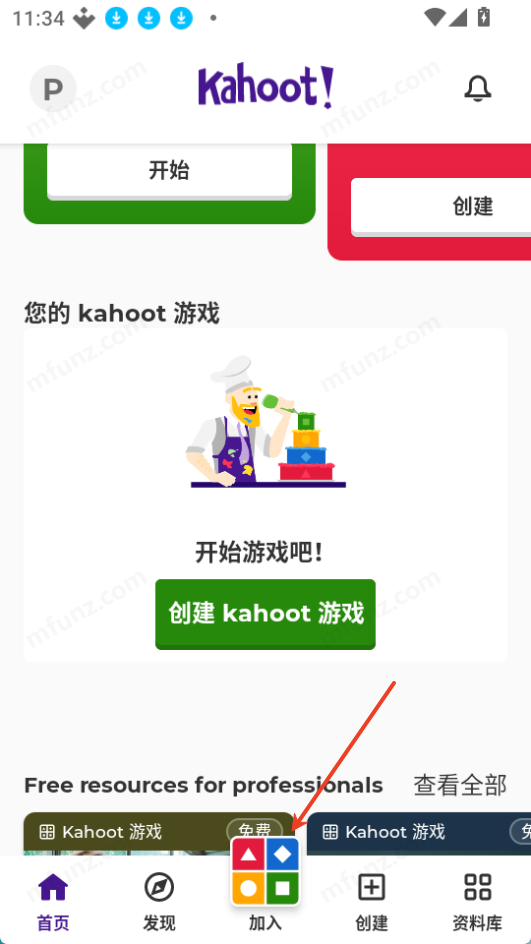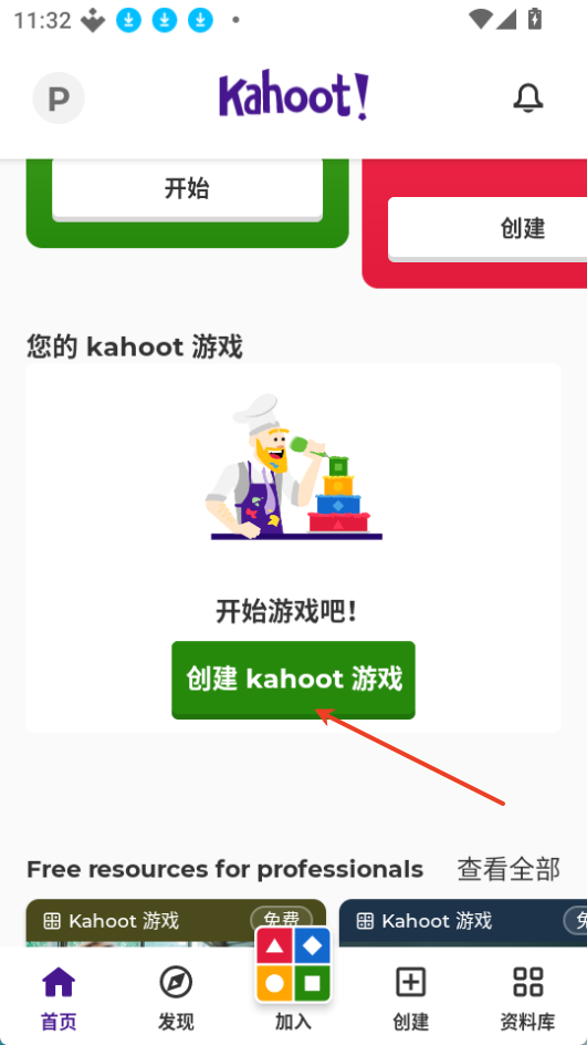 1.启动kahoot应用,在首页找到并点击“创建kahoot游戏”的选项