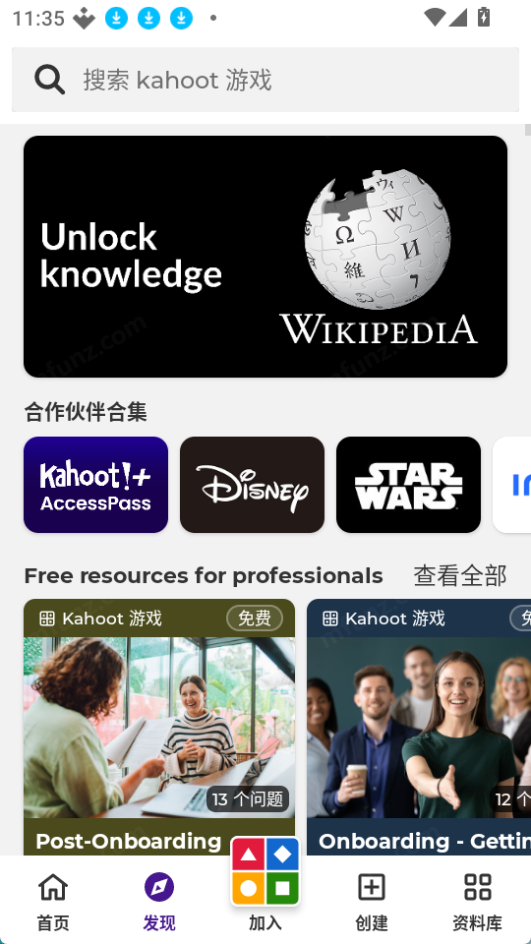 Kahoot同样支持通过空白画布进行创建,其资源库中能够查看课程、小组和学习相关内容,所有课程都会展示在这里。创建群组可用于合作、分享或是分配任务。