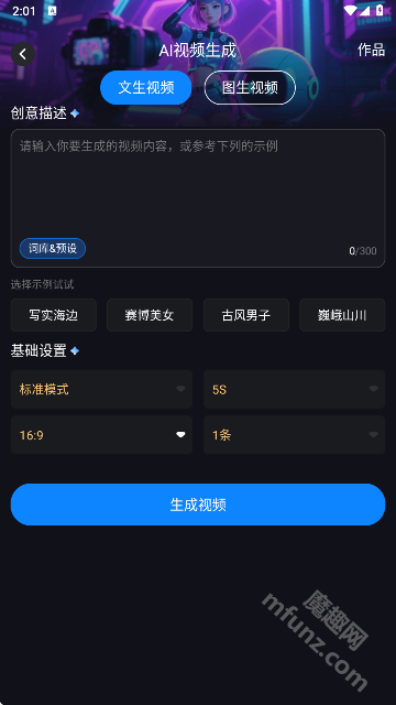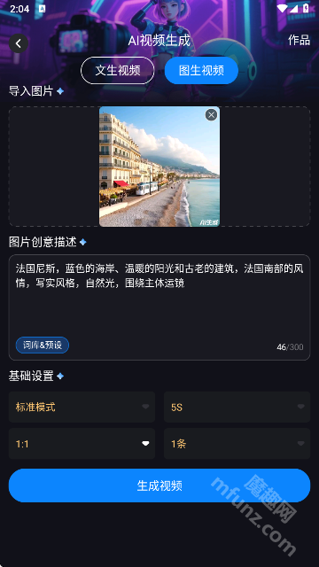 4、先导入图片,接着输入描述文字并完成基础设置,最后点击【生成视频】按钮就可以了。