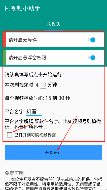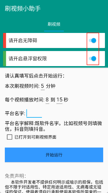 1、打开刷视频助手,开启无障碍和悬浮框权限。