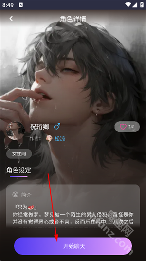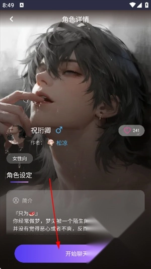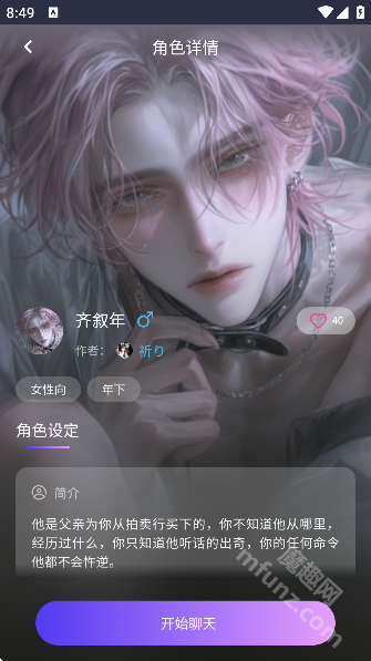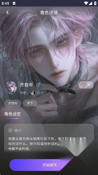 2、点击角色卡片进入角色详情页,查看角色设定(如齐叙年的背景介绍),点击“开始聊天”即可开启与该AI角色的互动。