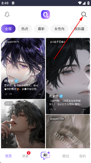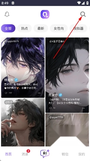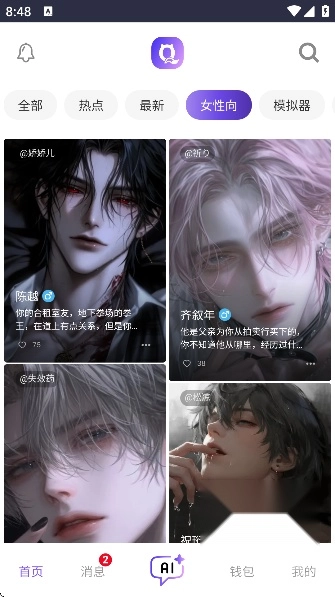 1、进入首页后,可通过“全部”“热点”“最新”“女性向”“模拟器”等分类标签筛选AI角色,例如点击“女性向”标签,找到心仪的角色(如齐叙年)。