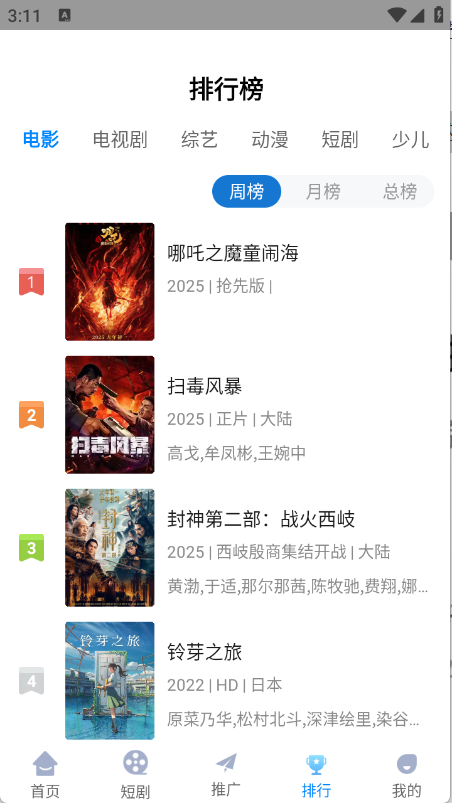2、在排行页面,用户能够依据当前热度浏览经过排序的影视作品。