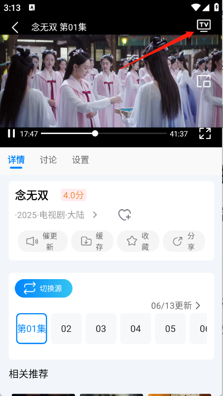 5、在播放页面的右上角找到“TV”图标并点击,系统将开始搜索可用设备。