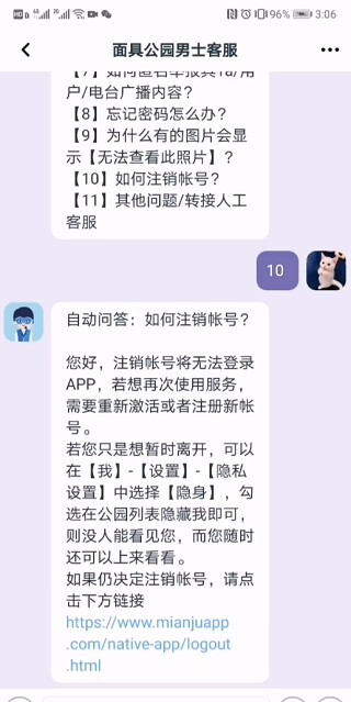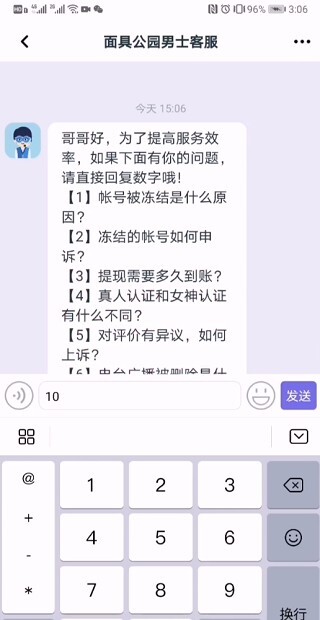 3、进入客服对话框后,依据提供的服务选项,在输入框内输入“10”。