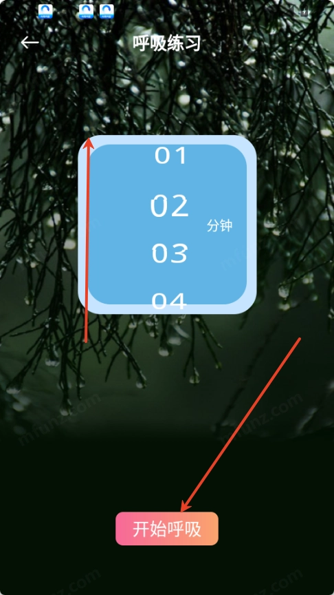 2.默认练习时间为1分钟,可以往上滑动调整时间,最后点击开始呼吸