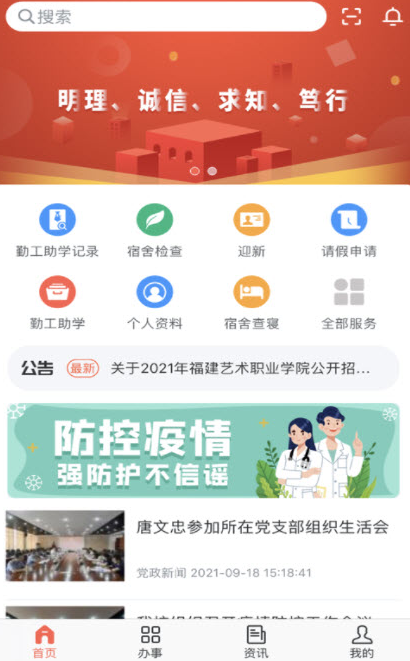 1、打开智慧艺苑,在首页可以使用请假申请等许多功能。