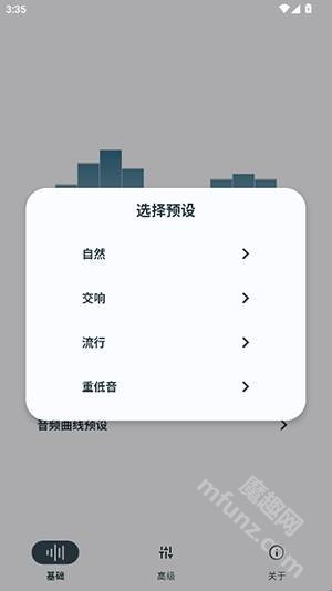 4、选择音频曲线预设,自然、交响、流行、重低音任你选。