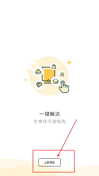 1、在应用引导页面点击【立即体验】按钮后,即可进入应用主功能区,使用涵盖衣食住行的各类综合服务。