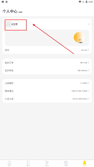 2、进入个人中心界面后,点击【未登录】区域,即可跳转至账号的登录或注册页面。