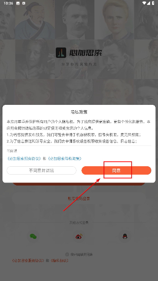 1、在隐私政策弹窗内,阅读相关条款后,点击【同意】按钮,进入后续的登录选择界面。