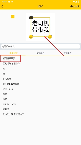 2、进入DIY页面后,在文案选择区域挑选目标文案(如“老司机带带我”),将其添加到表情包模板中。