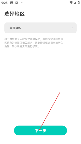 1、请选择【中国+86】作为所在地区,确认无误后点击【下一步】按钮,需要注意的是,该地区选择一旦确认提交后将无法再进行修改。