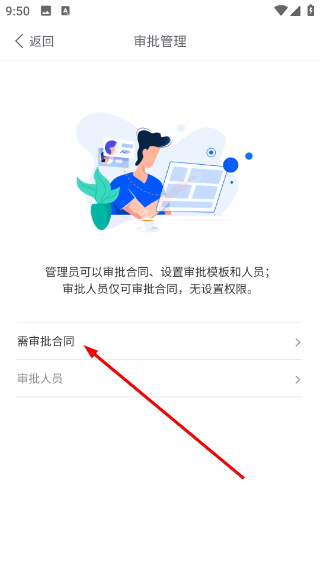 2、进入个人中心界面后,点击【审批管理】选项,即可进入审批管理页面,在此页面可以开展合同审批的相关配置工作。