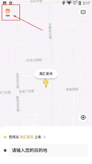 2、在软件的地图页面,点击左上角的头像图标,就能进入账号相关操作界面,该页面还会显示当前定位以及上下车点的设置区域。