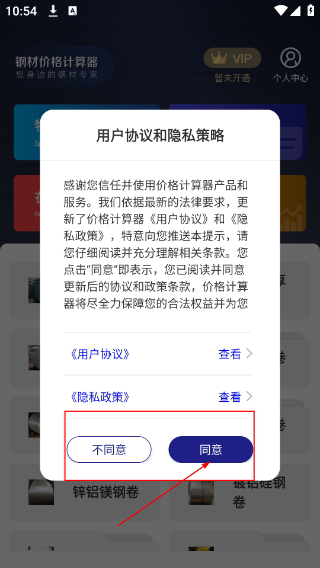 1、打开钢材价格计算器后,首先查看【用户协议】和【隐私政策】,在确认相关条款内容后点击【同意】按钮,完成协议确认步骤,这样就能使用产品的各项功能了。