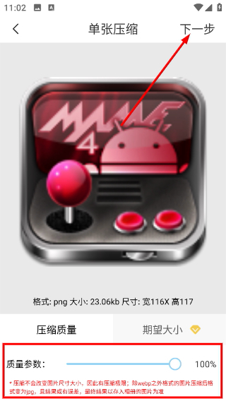 3、在单张压缩界面,可对压缩质量参数进行调整,参数设置完毕后,点击【下一步】按钮,即可启动图片压缩流程。
