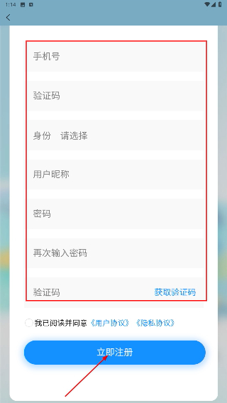 4、若选择注册,需依次填写【手机号】【验证码】【身份】等信息,设置密码,在获取验证码后勾选相关协议,点击【立即注册】即可完成账号创建。