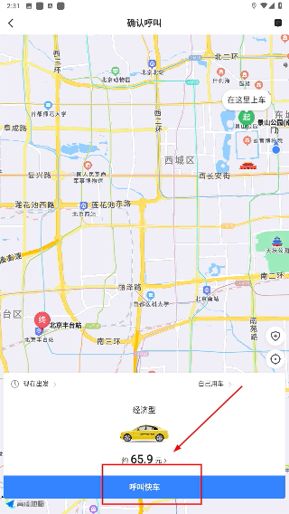 4、在确定行程的起点、终点以及车型(例如经济型)之后,点击【确认叫车】按钮,即可发起车辆呼叫请求。