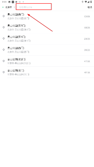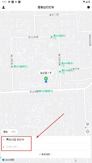1、在打车界面点击【在这里上车】的区域,挑选具体的上车地点(例如“景山公园-双亭”),以此确定行程的起点。