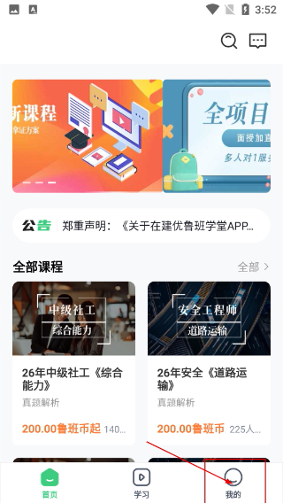 1、在学习类首页,找到【新课程】板块并点击进入其【全部课程】页面(该页面包含26年中级社工等课程),随后点击页面底部的【我的】按钮,即可进入个人功能页面。