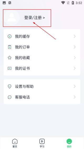 2、进入【我的】页面后,点击顶部的【登录/注册】按钮,完成这一步后,就能使用【我的缓存】【我的订单】等个人相关功能了。