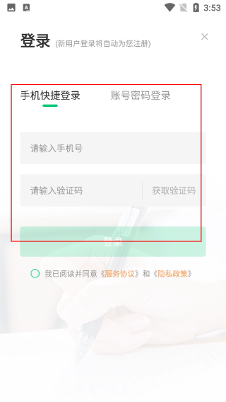 3、进入【登录】页面,选择【手机快捷登录】选项,依次填写【请输入手机号】和【请输入验证码】对应的内容,即可完成登录操作。