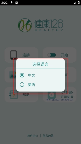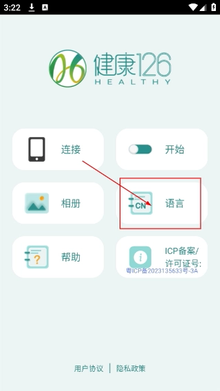 2、进入【健康126】主界面后,能看到【连接】【相册】【语言】等功能按钮,点击【语言】按钮即可进入语言选择界面。