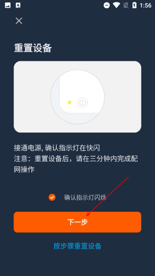 4、进入【重置设备】页面,待确认设备指示灯处于快闪状态后,勾选【确认指示灯闪烁】选项,再点击【下一步】按钮,以继续进行设备的配网操作。