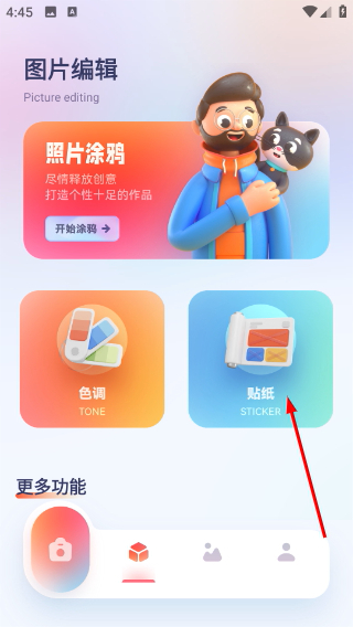 1、在图片编辑界面点击【贴纸】功能选项,即可进入贴纸添加的图片选择页面,此页面同时支持色调调整等编辑功能。