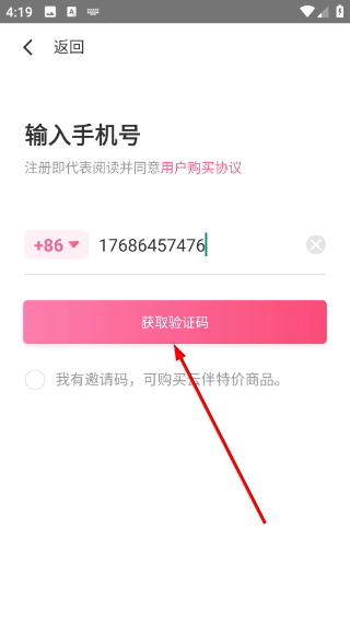 4、在注册流程的“输入手机号”页面,填写好手机号后点击【获取验证码】按钮,就能得到注册需要的验证码。