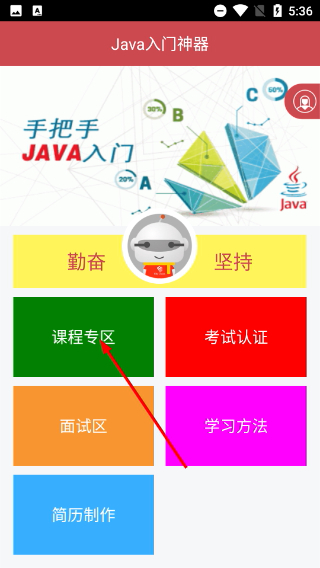1、在“Java入门神器”首页点击【课程专区】选项,即可进入Java课程的分类列表界面,此外该首页还设有考试认证、面试区等与学习相关的功能入口。