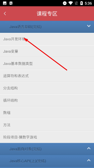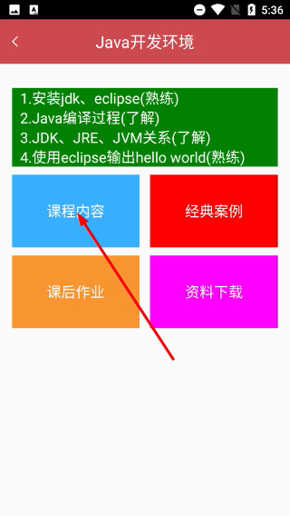 3、在“Java开发环境”页面点击【课程内容】选项,即可查看该模块所对应的具体知识点。