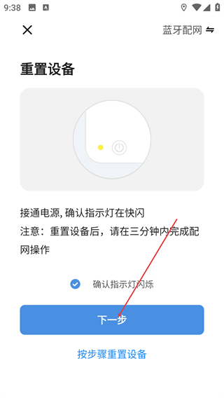 3、进入【重置设备】页面后,先接通设备电源,待确认指示灯处于快闪状态时,勾选【确认指示灯闪烁】选项,然后点击【下一步】按钮。