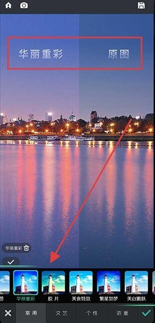 打开POCO相机软件,进入编辑界面后,上方会显示华丽重彩风格的原图对比效果。选择不同的滤镜,点击即可完成应用,还能实时预览照片效果的变化。
