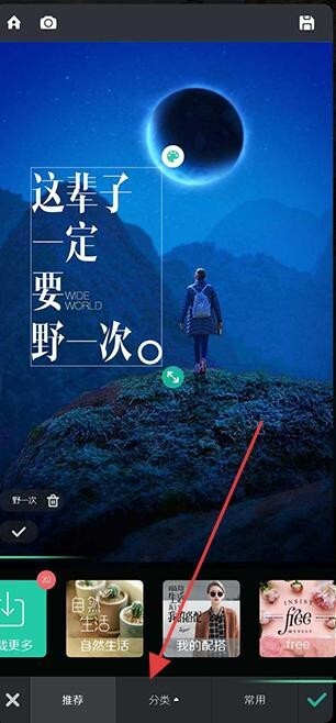 点击分类选项,展开风格分类列表,选择自然生活等模板,套用模板后对文字和元素进行编辑,从而打造出个性化的图文作品。