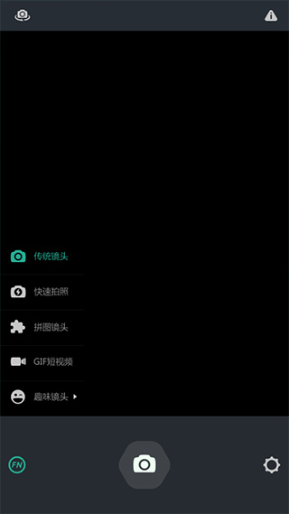 点击左下角的镜头切换键,弹出的菜单里除了传统镜头外,还能选择四格LOMO、二格镜头、微缩景观和拼图这四种特效镜头。