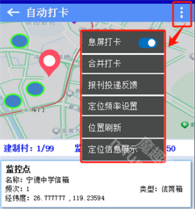 在【自动打卡】界面的右上角,轻点“┇”按钮后会弹出六个选项: