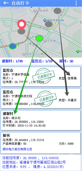 1、“息屏打卡”开关:当该开关开启后,设备处于息屏状态时能够自动完成打卡操作,此时会显示“息屏打卡,定位服务运行中”的提示。打卡成功后,监控点与建制村的状态将更新为“已息屏打卡”,原本的蓝色圆圈会切换为灰色,报刊相关数据会自动清除,点击未打卡数据的范围区域则会变成绿色。