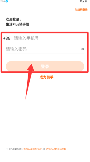 2、输入手机号及密码完成登录,或选择骑手注册选项。