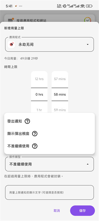 5、设置好上限时间后,选择【发出提醒、显示弹出窗口或者禁止继续使用】,最后点击储存即可。