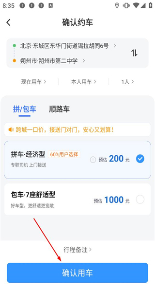 进入确认约车的页面后,先查看行程信息以及不同车型的价格,挑选好对应的车型,再点击确认用车按钮,这样就能完成约车流程了。