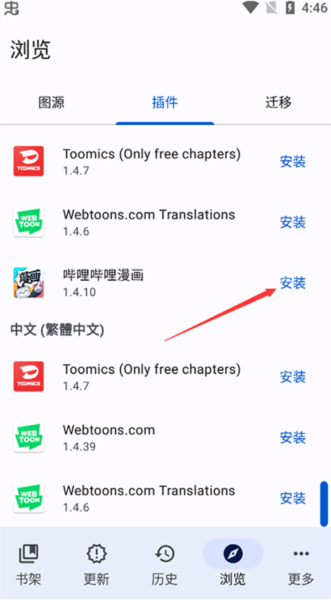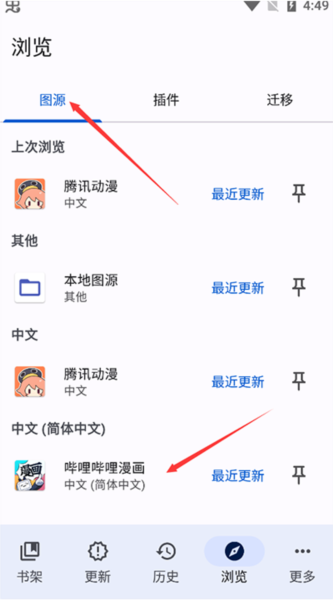 4、接着你就可以点击“图源”选项,找到刚才安装完成的哔哩哔哩漫画,再点击进入即可。