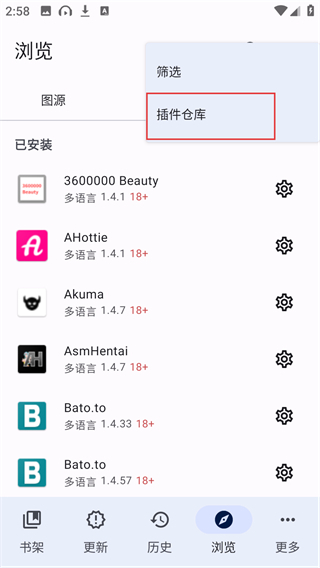 2、点击三点菜单,选择【插件仓库】选项,即可进入插件仓库页面,查看可供添加的插件源。