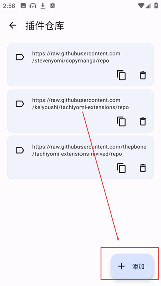 3、在插件仓库页面点击右下角的【添加】按钮,即可弹出添加仓库的输入框,以便准备输入新的插件源网址。