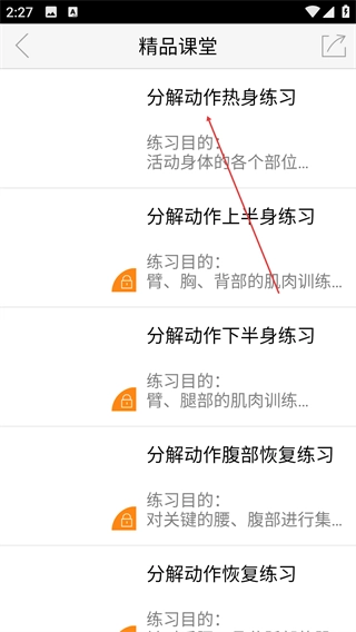 进入【精品课堂】页面,能浏览到【分解动作热身练习】【分解动作上半身练习】等多种分解动作练习课程,点击课程即可查看详情。