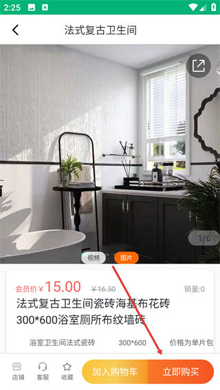 进入商品详情页面后,就能查看【法式复古卫生间瓷砖】的相关信息,点击【加入购物车】或者【立即购买】按钮即可完成相应操作。
