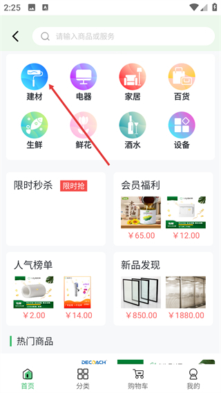 进入商城之后,点击【建材】分类,就可以查看建材类商品,与此同时还能浏览【限时秒杀】【会员福利】这些板块。