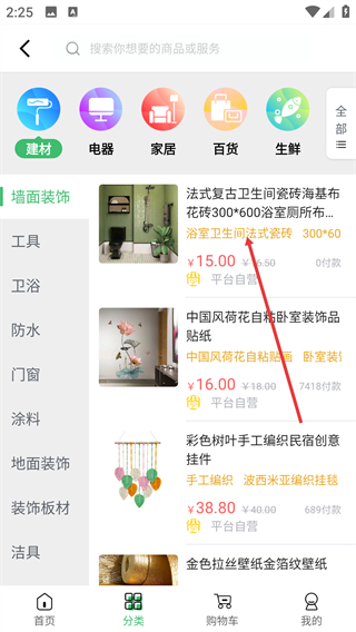 在建材分类中,点击【墙面装饰】子分类,即可浏览相关商品列表,选择心仪商品并点击进入详情页面。
