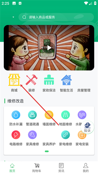 在界面里点击【商城】选项,就能进入商品浏览区域,还可以选择【维修改造】分类下的各类服务选项。